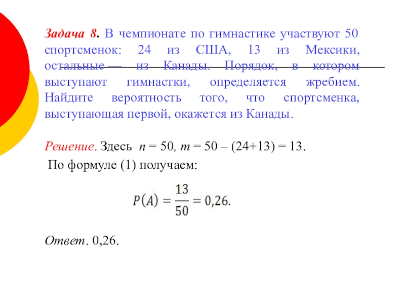 9. В чемпионате по гимнастике участвуют 50 спортсменок: 17 из России, 22 из США, остальные — из Китая. Порядок, в котором выступают гимнастки, определяется жребием. Найдите вероятность того, что спортсменка, выступающая первой, окажется из Китая. (Ответ: 0,22)