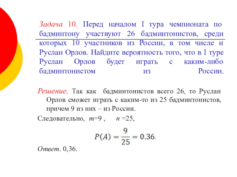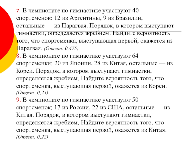 9 из Бразилии, остальные — из Парагвая. Порядок, в котором выступают гимнастки, определяется жребием. Найдите вероятность того, что спортсменка, выступающая первой, окажется из Парагвая. (Ответ: 0,475)