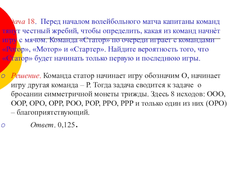Решение. Введем события: В – выигрыш, Н – ничья, П – проигрыш, А – команда набрала не менее 4 очка. Событие А произойдет, если произойдет хотя бы одно из трех несовместных событий: ВВ, НВ или ВН. Тогда