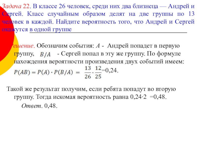 Решение. Обозначим события: А - Андрей попадет в первую группу, - Сергей попал в эту же группу. По формуле нахождения вероятности произведения двух событий имеем: