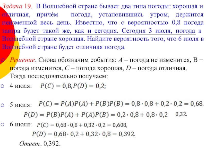 Р(А) = Р(В)∙Р(В)+Р(Н)∙Р(В) +Р(В)∙Р(Н) =0,4∙0,4 +0,2∙0,4+ 0,4∙0,2=0,32.