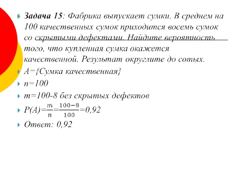 11. Фабрика выпускает сумки. В среднем на 100 качественных сумок приходится восемь сумок со скрытыми дефектами. Найдите вероятность того, что купленная сумка окажется качественной. Результат округлите до сотых. (Ответ: 0,92)
