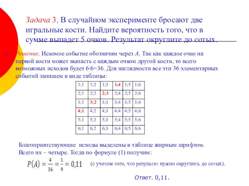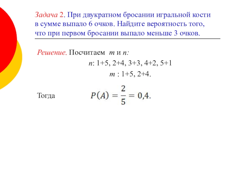 Слайд 14Задача 2. При двукратном бросании игральной кости в сумме выпало 6