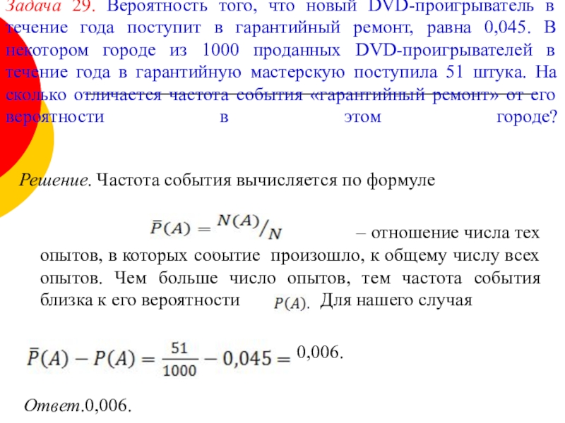 Слайд 49Задача 29. Вероятность того, что новый DVD-проигрыватель в течение года поступит