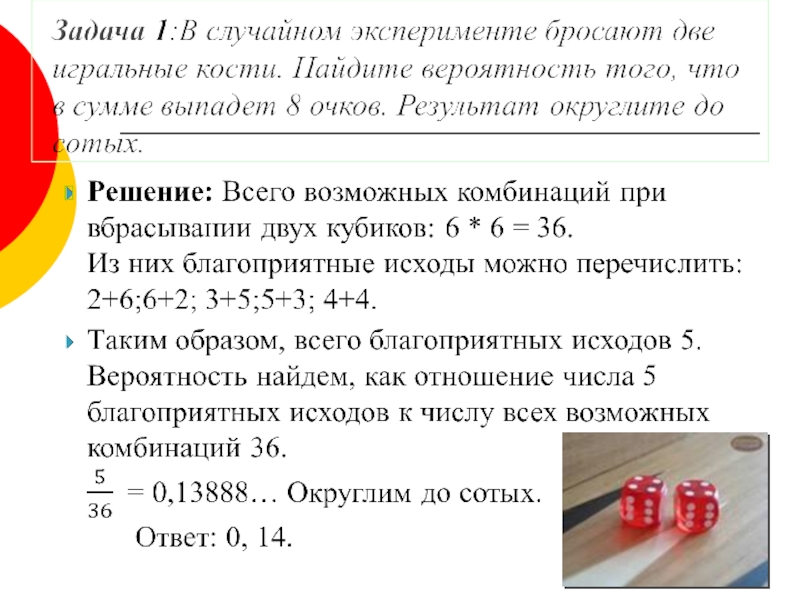Слайд 13Задача 1. Брошена игральная кость. Какова вероятность того, что выпадет число,