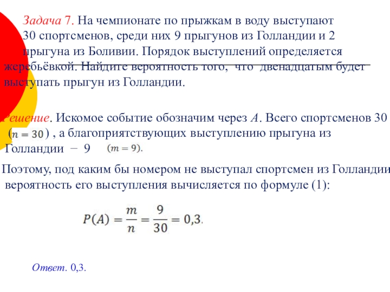 8 спортсменов из Хорватии и 10 — из Словении. Порядок, в котором выступают спортсмены, определяется жребием. Найдите вероятность того, что спортсмен, который выступает последним, окажется из Сербии. (Ответ: 0,3)