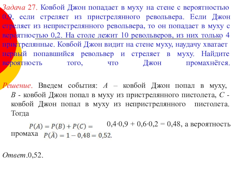 Слайд 47Задача 27. Ковбой Джон попадает в муху на стене с вероятностью
