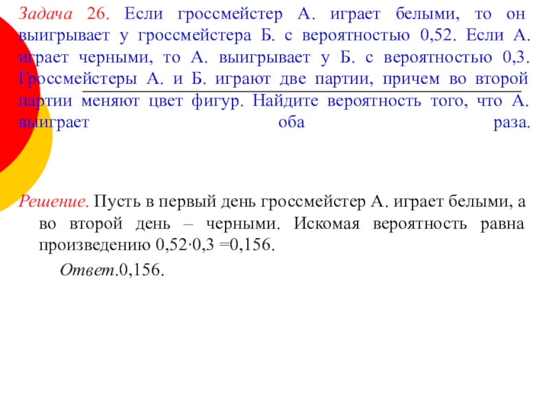 Решение. Пусть в первый день гроссмейстер А. играет белыми, а во второй день – черными. Искомая вероятность равна произведению 0,52∙0,3 =0,156.