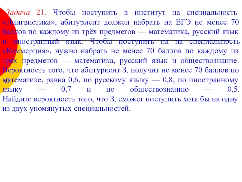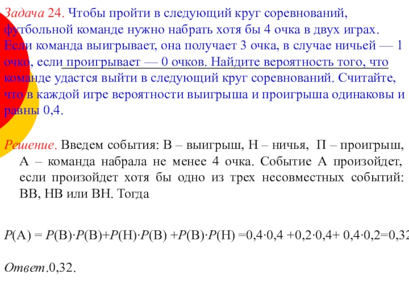 Слайд 43Задача 24. Чтобы пройти в следующий круг соревнований, футбольной команде нужно