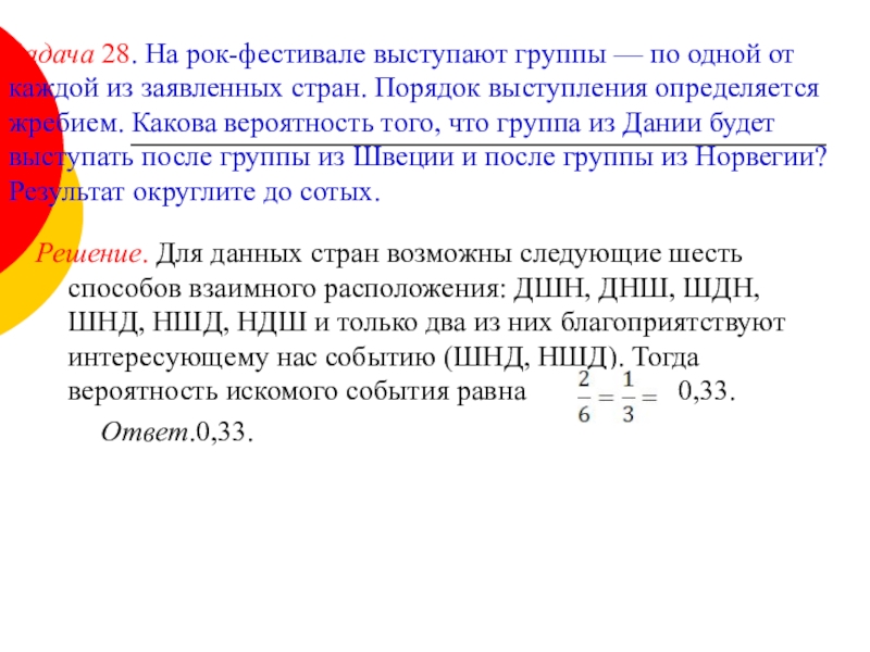 Слайд 48Задача 28. На рок-фестивале выступают группы — по одной от каждой