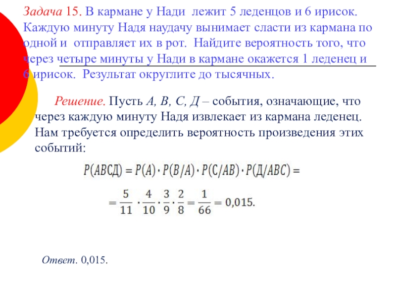 17.В кармане у Нади лежит 5 леденцов и 6 ирисок. Каждую минуту Надя наудачу вынимает сласти из кармана по одной и отправляет их в рот. Найдите вероятность того, что через четыре минуты у Нади в кармане окажется 5 леденцов и 2 ириски. Результат округлите до тысячных. (Ответ: 0,045)