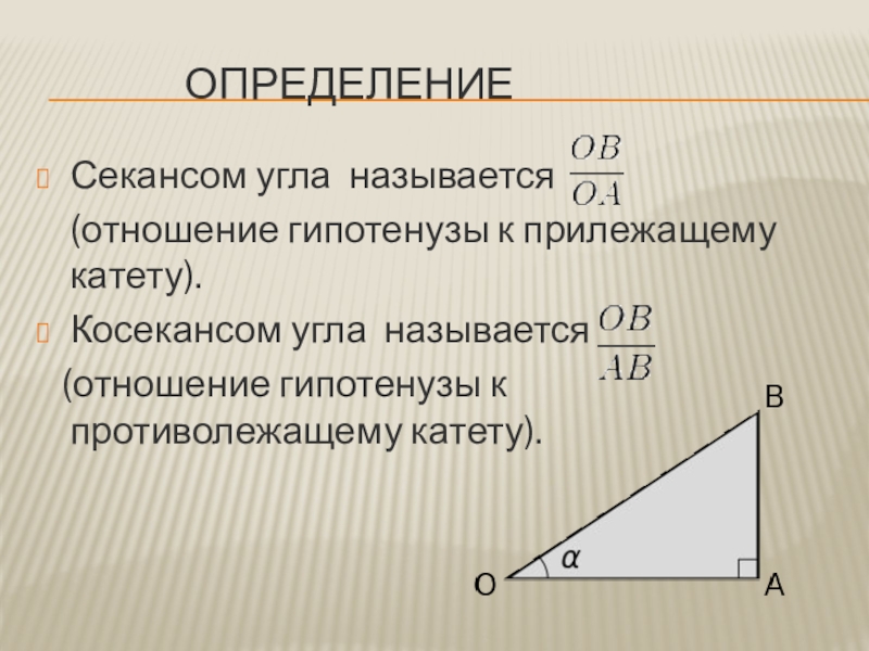 ОпределениеСекансом угла  называется    (отношение гипотенузы к прилежащему катету).Косекансом угла  называется