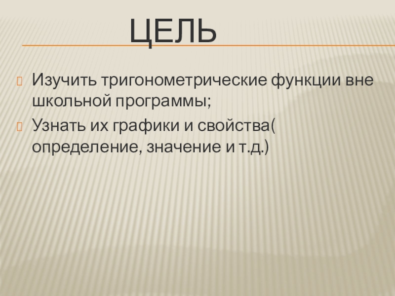 ЦЕЛЬИзучить тригонометрические функции вне школьной программы;Узнать их графики и свойства( определение, значение и т.д.)