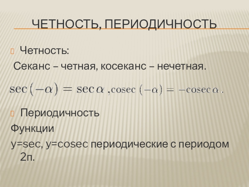 Четность, периодичностьЧетность: Секанс – четная, косеканс – нечетная.ПериодичностьФункции y=sec, y=cosec периодические с периодом