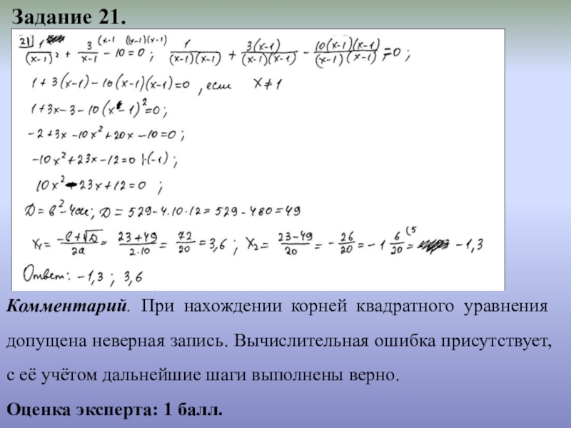 Комментарий. При нахождении корней квадратного уравнения допущена неверная запись. Вычислительная