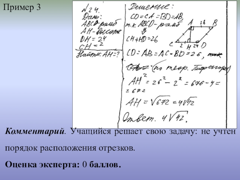Комментарий. Учащийся использует данные, которых нет в условии (считая острый угол ромба 60°). Оценка эксперта: 0 баллов