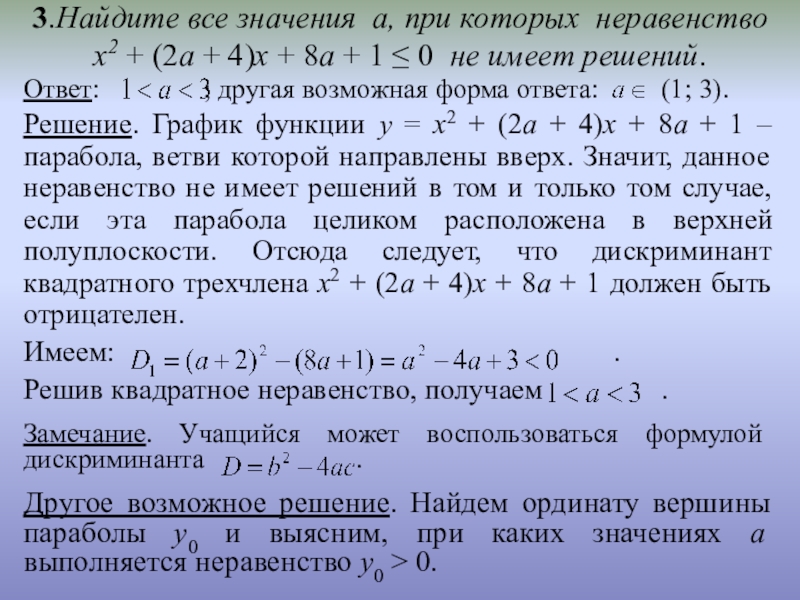 Решение. График функции у = х2 + (2а + 4)х + 8а + 1 – парабола, ветви которой направлены вверх. Значит, данное неравенство не имеет решений в том и только том случае, если эта парабола целиком расположена в верхней полуплоскости. Отсюда следует, что дискриминант квадратного трехчлена х2 + (2а + 4)х + 8а + 1 должен быть отрицателен.