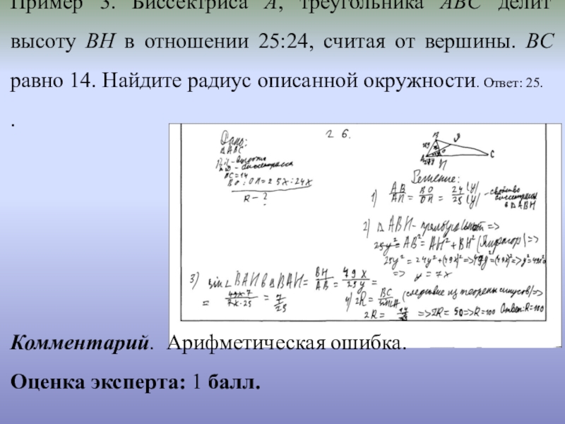 Если в решении допущена ошибка непринципиального характера (вычислительная, погрешность в терминологии или символике и др.), не влияющая на правильность общего хода решения (даже при неверном ответе) и позволяющая, несмотря на ее наличие, сделать вывод о владении материалом, то учащемуся засчитывается балл, на 1 меньший указанного, что и отражено в критериях оценивания заданий с развернутым ответом.