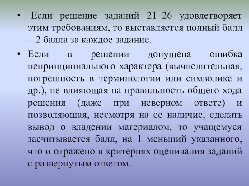 Слайд 11 Если решение заданий 21–26 удовлетворяет этим требованиям, то выставляется полный балл