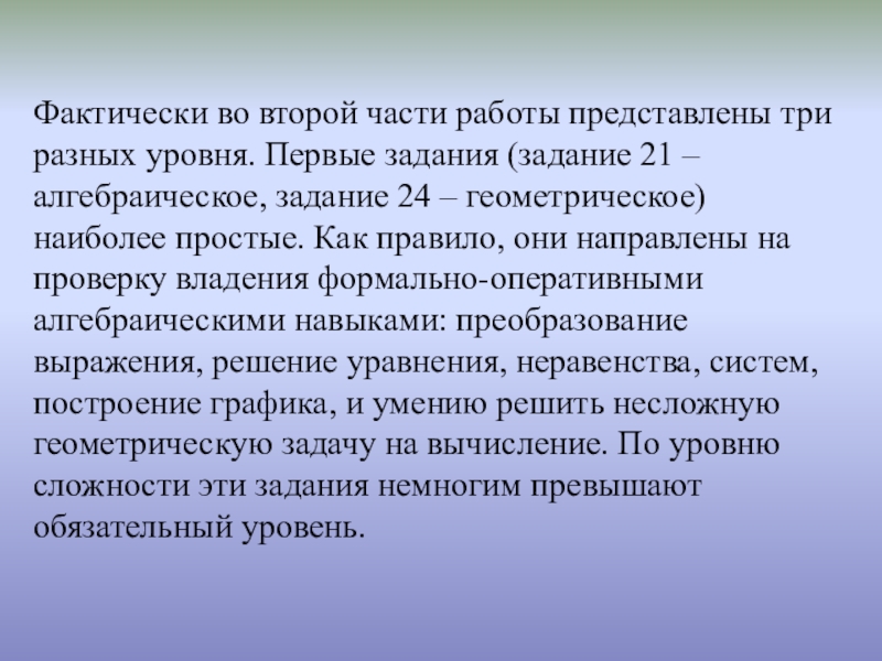 (задание 21 – алгебраическое, задание 24 – геометрическое) наиболее простые. Как правило, они направлены на проверку владения формально-оперативными алгебраическими навыками: преобразование выражения, решение уравнения, неравенства, систем, построение графика, и умению решить несложную геометрическую задачу на вычисление. По уровню сложности эти задания немногим превышают обязательный уровень.