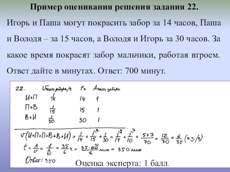 14 часов, Паша и Володя – за 15 часов, а Володя и Игорь за 30 часов. За какое время покрасят забор мальчики, работая втроем. Ответ дайте в минутах. Ответ: 700 минут.