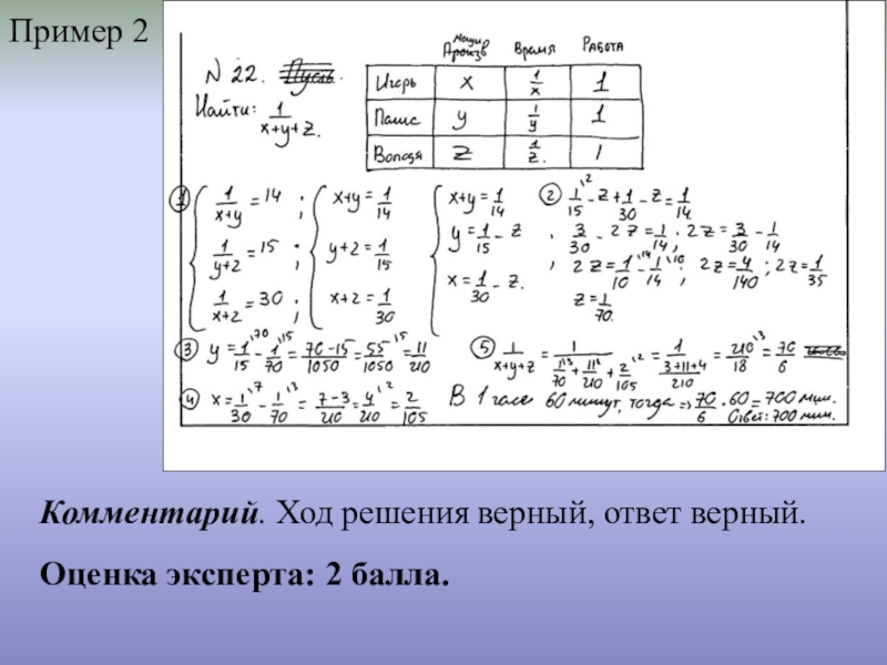 развернутым ответом заключаются в следующем: решение должно быть математически грамотным и полным, из него должен быть понятен ход рассуждений учащегося. Оформление решения должно обеспечивать выполнение указанных выше требований, а в остальном может быть произвольным. Не следует требовать от учащихся слишком подробных комментариев (например, описания алгоритмов). Лаконичное решение, не содержащее неверных утверждений, все выкладки которого правильны, следует рассматривать как решение без недочетов.