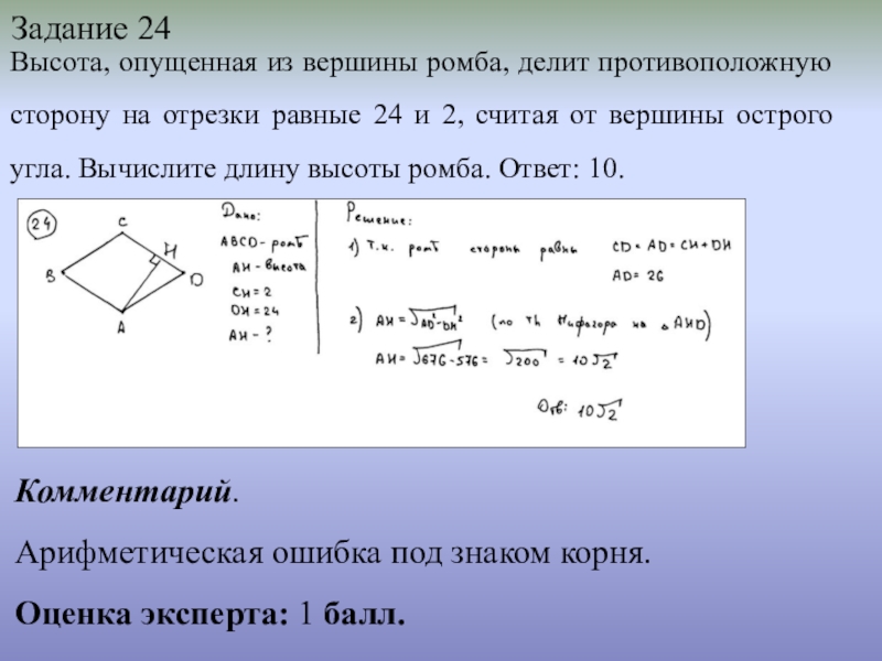 равные 24 и 2, считая от вершины острого угла. Вычислите длину высоты ромба. Ответ: 10.