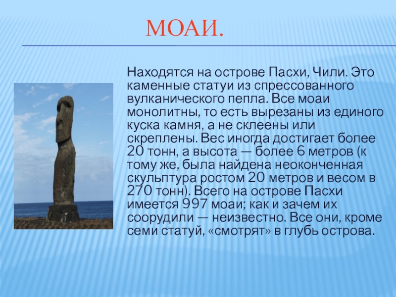 Находятся на острове Пасхи, Чили. Это каменные статуи из спрессованного вулканического пепла. Все моаи монолитны, то есть вырезаны из единого куска камня, а не склеены или скреплены. Вес иногда достигает более 20 тонн, а высота — более 6 метров (к тому же, была найдена неоконченная скульптура ростом 20 метров и весом в 270 тонн). Всего на острове Пасхи имеется 997 моаи; как и зачем их соорудили — неизвестно. Все они, кроме семи статуй, «смотрят» в глубь острова.