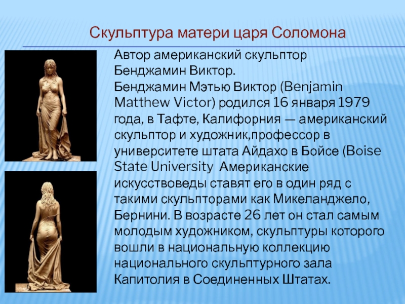 Бенджамин Мэтью Виктор (Benjamin Matthew Victor) родился 16 января 1979 года, в Тафте, Калифорния — американский скульптор и художник,профессор в университете штата Айдахо в Бойсе (Boise State University Американские искусствоведы ставят его в один ряд с такими скульпторами как Микеланджело, Бернини. В возрасте 26 лет он стал самым молодым художником, скульптуры которого вошли в национальную коллекцию национального скульптурного зала Капитолия в Соединенных Штатах.