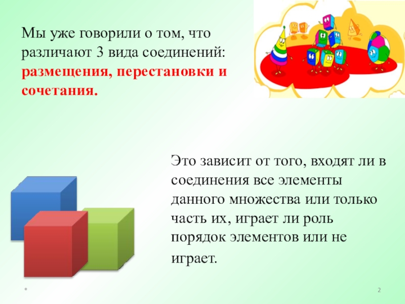 Это зависит от того, входят ли в соединения все элементы данного множества или только часть их, играет ли роль порядок элементов или не играет.