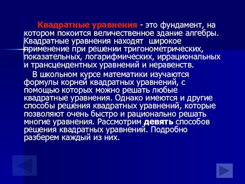 котором покоится величественное здание алгебры. Квадратные уравнения находят широкое применение при решении тригонометрических, показательных, логарифмических, иррациональных и трансцендентных уравнений и неравенств.