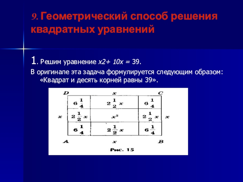 9. Геометрический способ решения квадратных уравнений1. Решим уравнение х2+ 10х = 39.В оригинале эта задача формулируется следующим