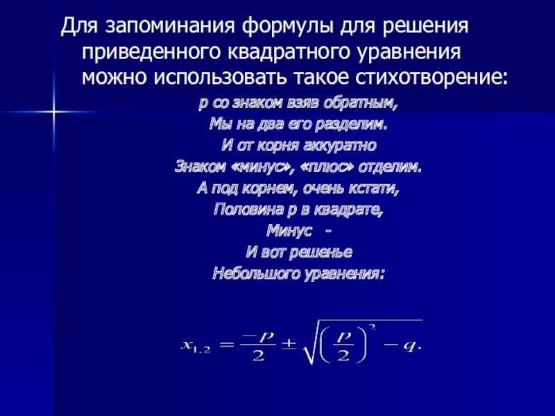 Слайд 13Для запоминания формулы для решения приведенного квадратного уравнения можно использовать такое