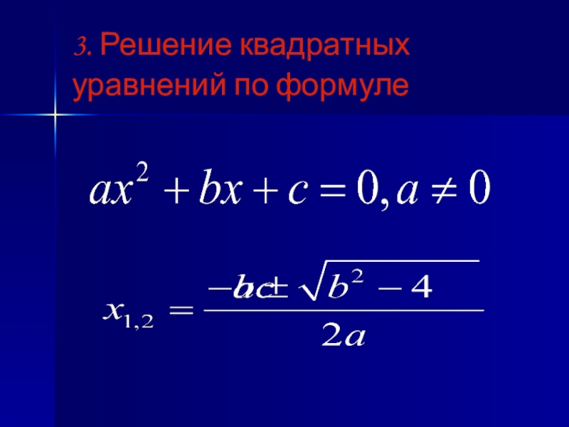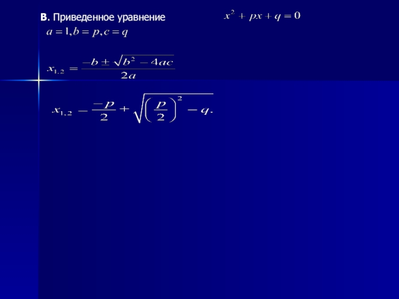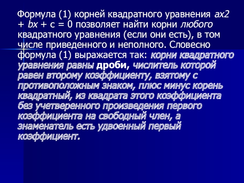 с = 0 позволяет найти корни любого квадратного уравнения (если они есть), в том числе приведенного и неполного. Словесно формула (1) выражается так: корни квадратного уравнения равны дроби, числитель которой равен второму коэффициенту, взятому с противоположным знаком, плюс минус корень квадратный, из квадрата этого коэффициента без учетверенного произведения первого коэффициента на свободный член, а знаменатель есть удвоенный первый коэффициент.