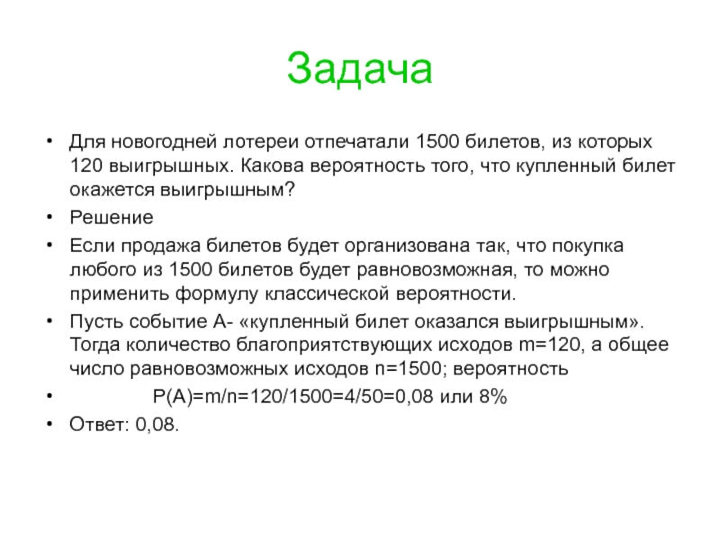 Пусть событие А- «купленный билет оказался выигрышным». Тогда количество благоприятствующих исходов m=120, а общее число равновозможных исходов n=1500; вероятность