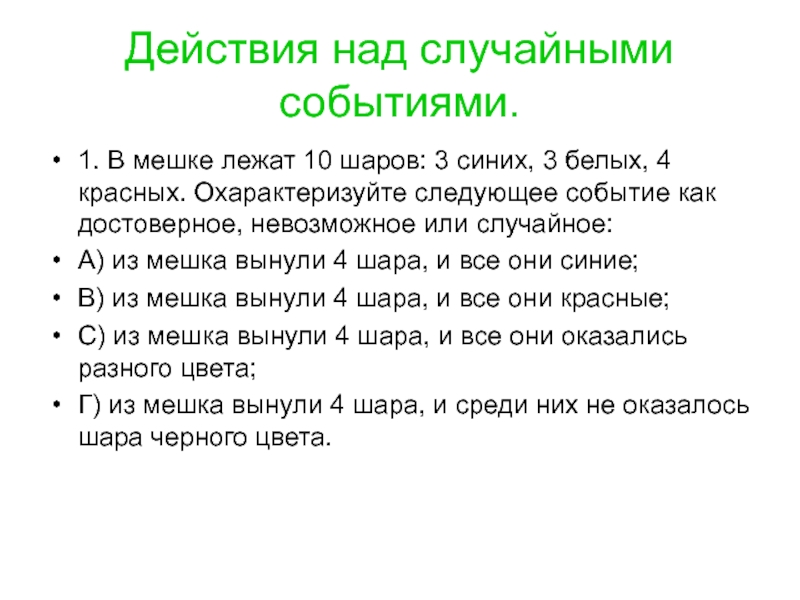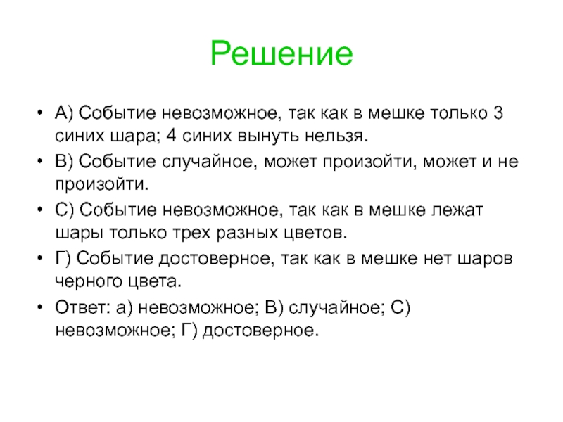 Г) из мешка вынули 4 шара, и среди них не оказалось шара черного цвета.