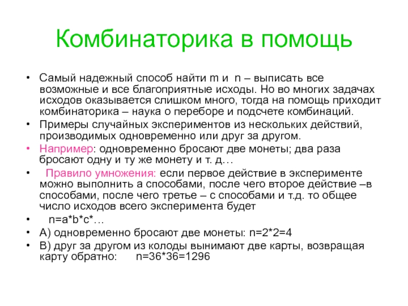 все возможные и все благоприятные исходы. Но во многих задачах исходов оказывается слишком много, тогда на помощь приходит комбинаторика – наука о переборе и подсчете комбинаций.