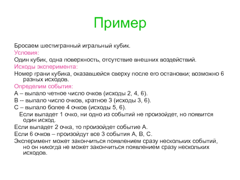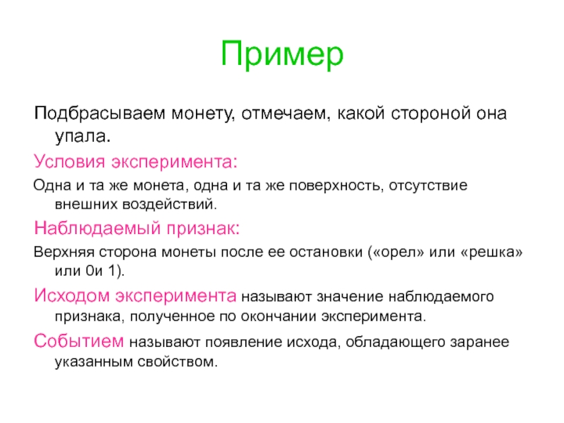 Исходом эксперимента называют значение наблюдаемого признака, полученное по окончании эксперимента.