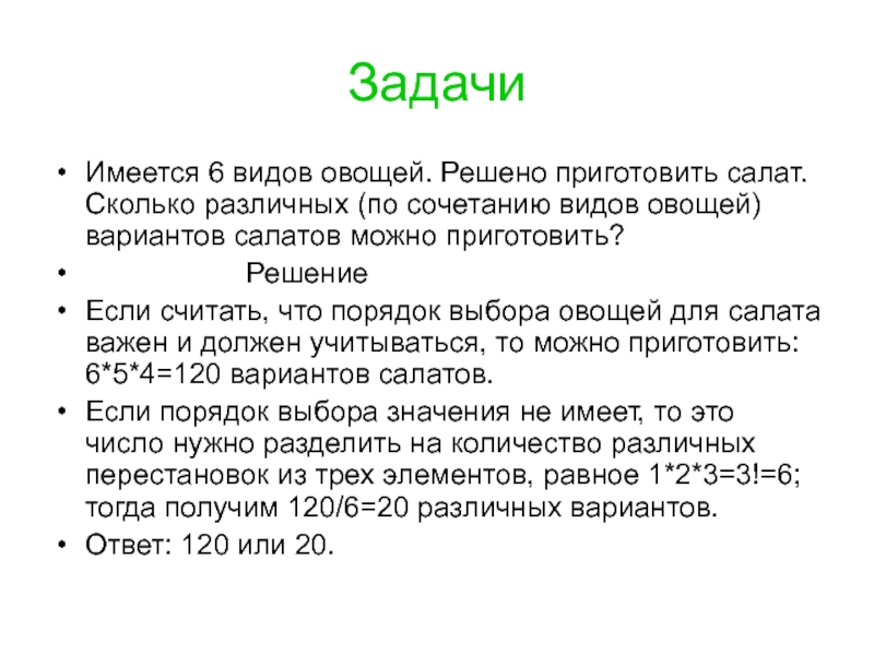 Если считать, что порядок выбора овощей для салата важен и должен учитываться, то можно приготовить: 6*5*4=120 вариантов салатов.