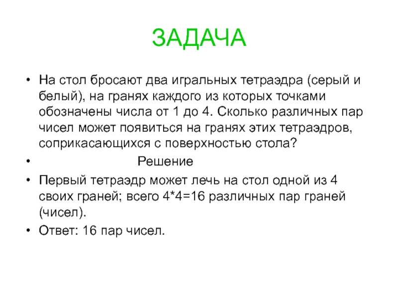 Первый тетраэдр может лечь на стол одной из 4 своих граней; всего 4*4=16 различных пар граней (чисел).