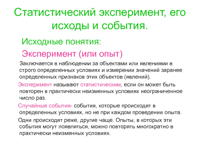 Слайд 4Статистический эксперимент, его исходы и события.