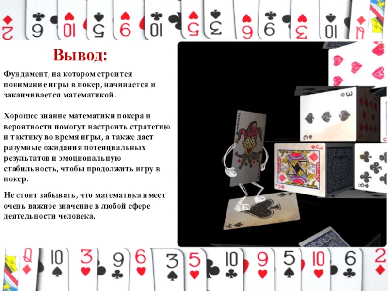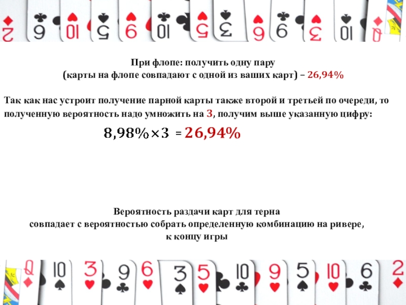 Всего неизвестных карт до флопа – 50, после выкладывания первой карты флопа – 49, второй – 48. Итак, перемножаем вероятности получить первую карту нам в пару, и двух других – не совпадающих с нашими карманными и между собой: