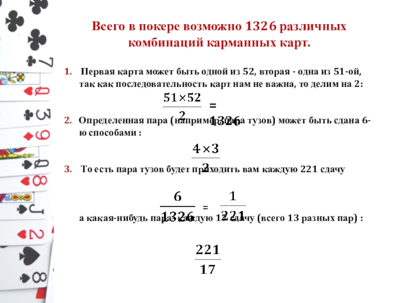 Всего в покере возможно 1326 различных комбинаций карманных карт.