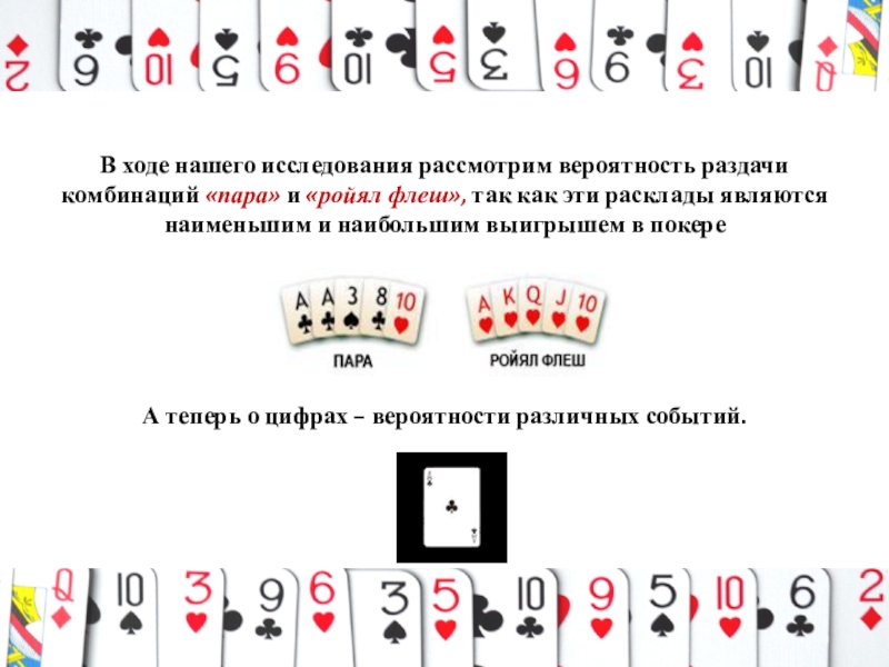 Рассмотреть вероятность раздачи комбинаций «пара» и «ройял флеш».