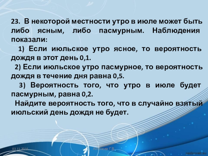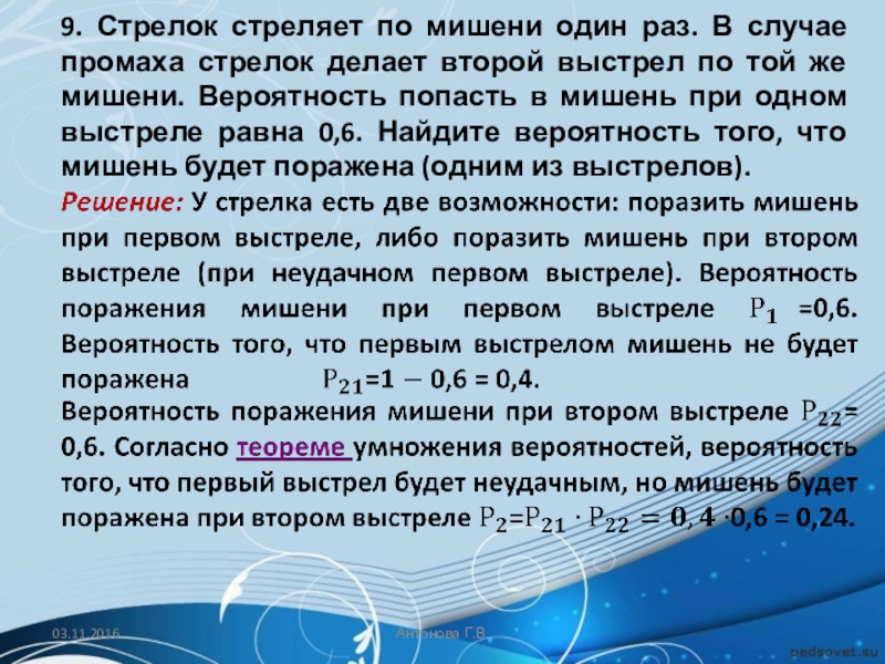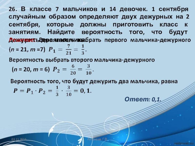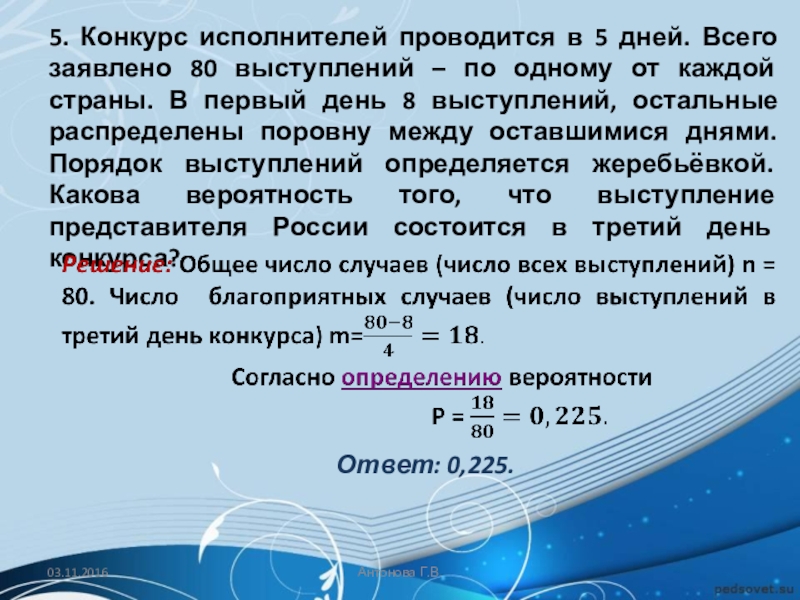 Решение: Общее число случаев (число участников, исключая самого Руслана Орлова) n = 26 – 1 = 25.