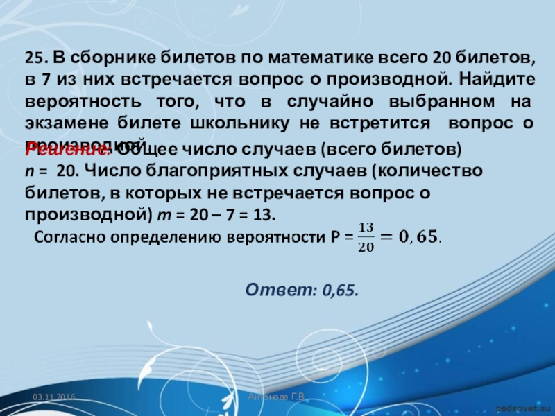 n = 20. Число благоприятных случаев (количество билетов, в которых не встречается вопрос о производной) m = 20 – 7 = 13.