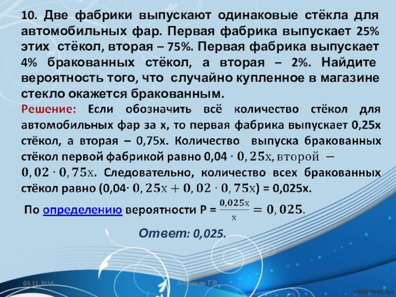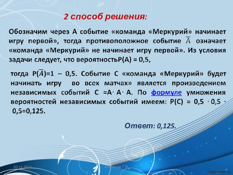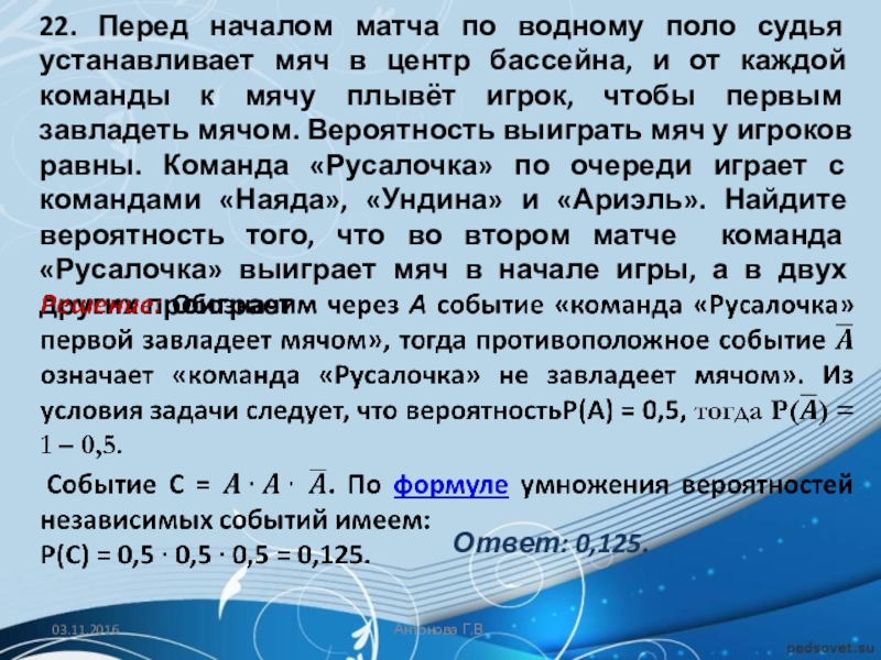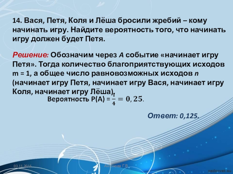 Решение: Обозначим через A событие «начинает игру Петя». Тогда количество благоприятствующих исходов m = 1, а общее число равновозможных исходов n (начинает игру Петя, начинает игру Вася, начинает игру Коля, начинает игру Лёша).
