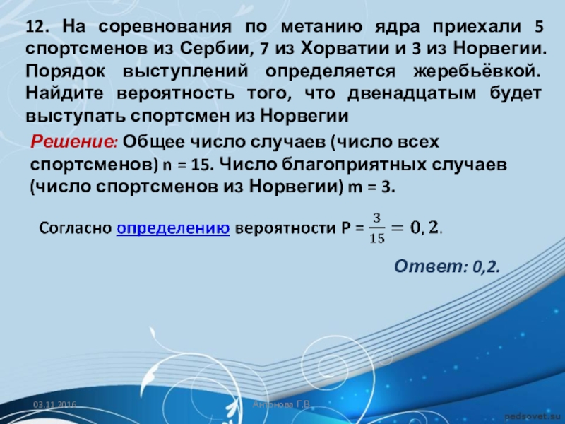 Решение: Общее число случаев (число всех спортсменов) n = 15. Число благоприятных случаев (число спортсменов из Норвегии) m = 3.