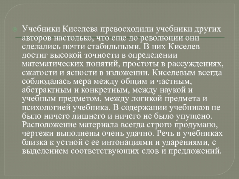 они сделались почти стабильными. В них Киселев достиг высокой точности в определении математических понятий, простоты в рассуждениях, сжатости и ясности в изложении. Киселевым всегда соблюдалась мера между общим и частным, абстрактным и конкретным, между наукой и учебным предметом, между логикой предмета и психологией учебника. В содержании учебников не было ничего лишнего и ничего не было упущено. Расположение материала всегда строго продумано, чертежи выполнены очень удачно. Речь в учебниках близка к устной с ее интонациями и ударениями, с выделением соответствующих слов и предложений.