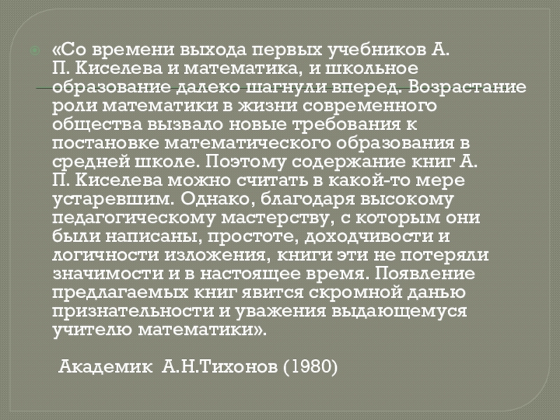 Слайд 9«Со времени выхода первых учебников А.П. Киселева и математика, и школьное образование